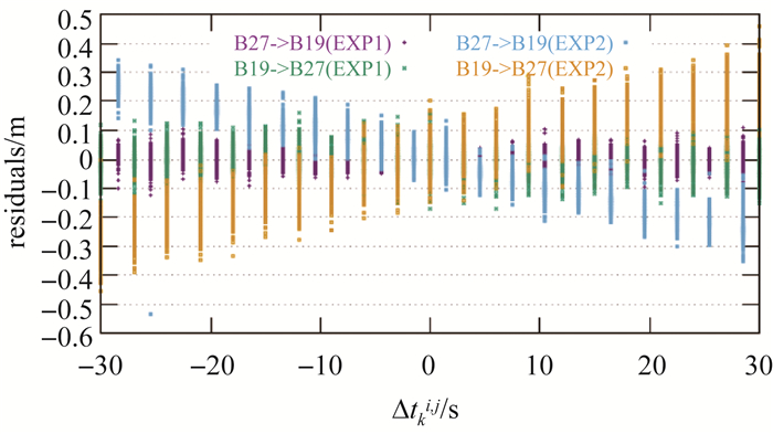 | 图 2 典型链路的Ka伪距残差与Δtki, j的关系 Fig. 2 Residuals of Ka-pseudoranges for the link B27-B19 as a function of Δtki, j (the difference of the observation time to the reference time of each 1-min time slot) |