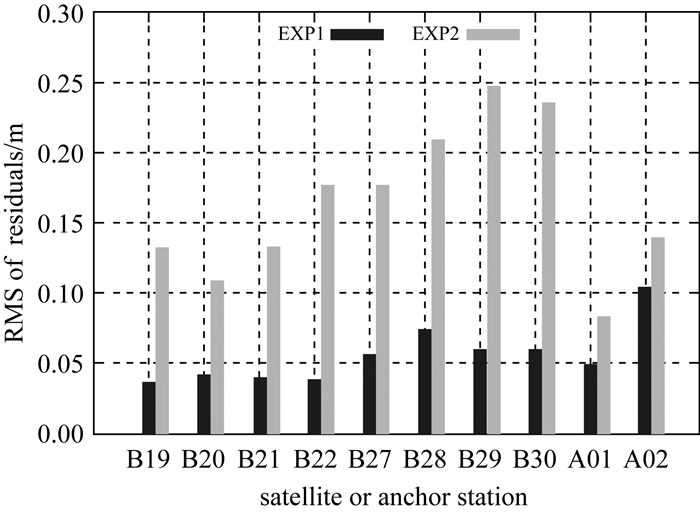 | 图 3 按信号接收端统计的Ka伪距残差的RMS Fig. 3 The RMS of one-way Ka-pseudorange residuals of each satellite or anchor station |