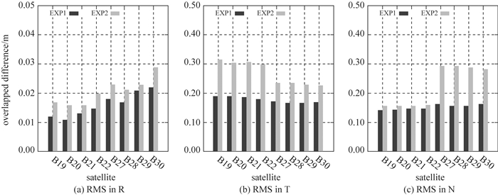 图 4给出了两组试验中各颗卫星轨道重叠段互差的RMS。可以看出,R方向的RMS都小于0.03 m,试验2的结果比试验1的稍大;试验1中各颗卫星在T和N方向的RMS都小于0.2 m;试验2中,各颗卫星在T和N方向的RMS都小于0.4 m。
