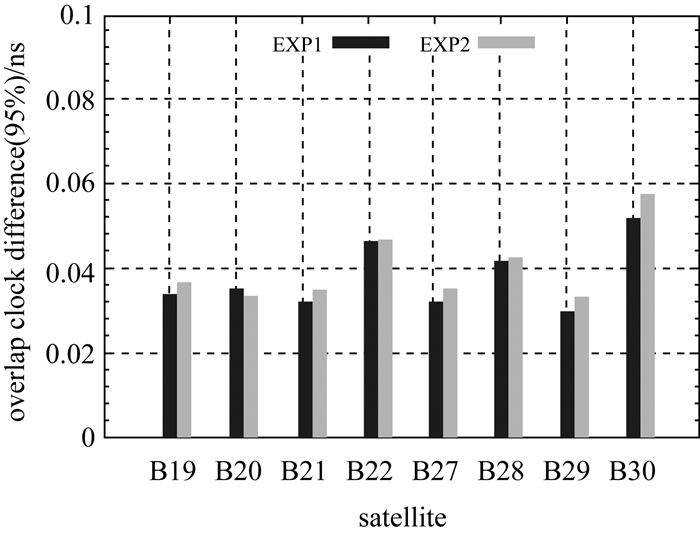 图 5给出了各卫星钟差重叠互差(95%)。可以看出,两组试验中,各颗卫星钟差精度都优于0.06 ns。试验2的重叠段互差略大一些。