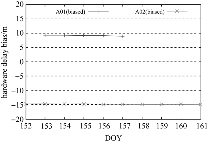 虽然本文解算了每个锚固站的接收和发射时延,但是只有二者之和才有意义。图 6给出了试验1获得的两个锚固站的收发硬件时延之和的估值序列(扣除了一个常数偏差)。A01只在其中5个弧段与超过两颗卫星进行建链观测,可以获得硬件时延的解。统计表明,A01和A02的收发硬件时延之和的估值序列的标准差分别为0.097、0.134 m;试验2中,对应的数值分别为0.052、0.203 m。两组试验中,两个锚固站的收发时延之和的均值互差都不超过0.11 m。