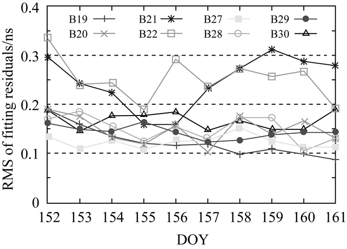 | 图 8 各颗卫星钟差拟合残差的RMS序列 Fig. 8 RMS of fitting clock residuals for each solution-arc and each satellite |