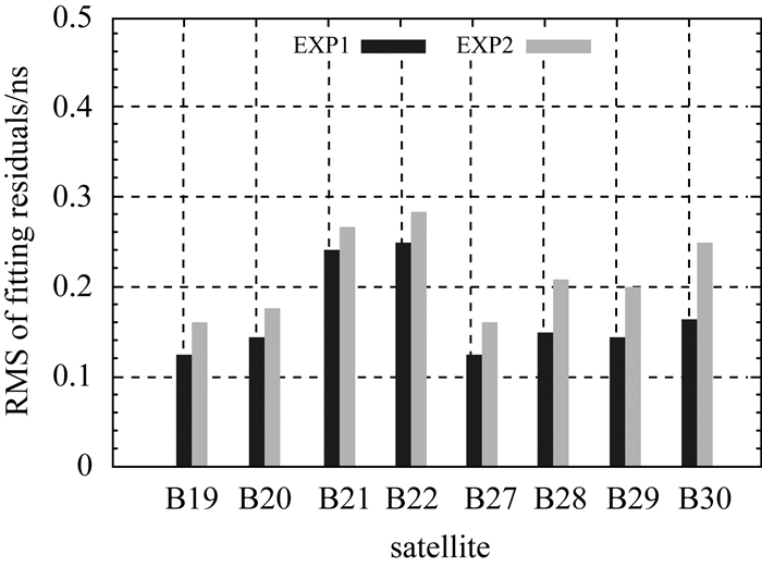 图 8给出了每个弧段各颗卫星的钟差拟合残差的RMS序列。可以看出,B21和B22的RMS在多数弧段都大于0.2 ns,普遍大于其他卫星,而其他卫星的RMS则都小于0.2 ns。图 9统计了各颗卫星钟差拟合残差的平均RMS。两组试验中,各颗卫星的RMS都小于0.3 ns,B21和B22的平均RMS显著大于其他卫星,所有卫星平均的RMS分别为0.169、0.214 ns。与试验1相比,试验2的卫星钟差拟合残差RMS增大了26.6%。