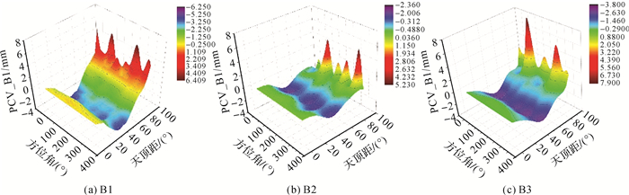由图 10可以看出,BDS PCV的变化趋势和GPS同样呈现随着天顶距增大(高度角降低)而先减小后增大的波谷形状。在45°左右,3个频点最小可分别达到-4.1、-1.9、-2.7 mm。在天顶距达到90°时,3个频点最大可分别达到5.7、5.1、7.8 mm。方位角变化对BDS PCV整体影响较小,在天顶距大于85°时,其波动性较大,峰值-峰值最大达到了5.6 mm。