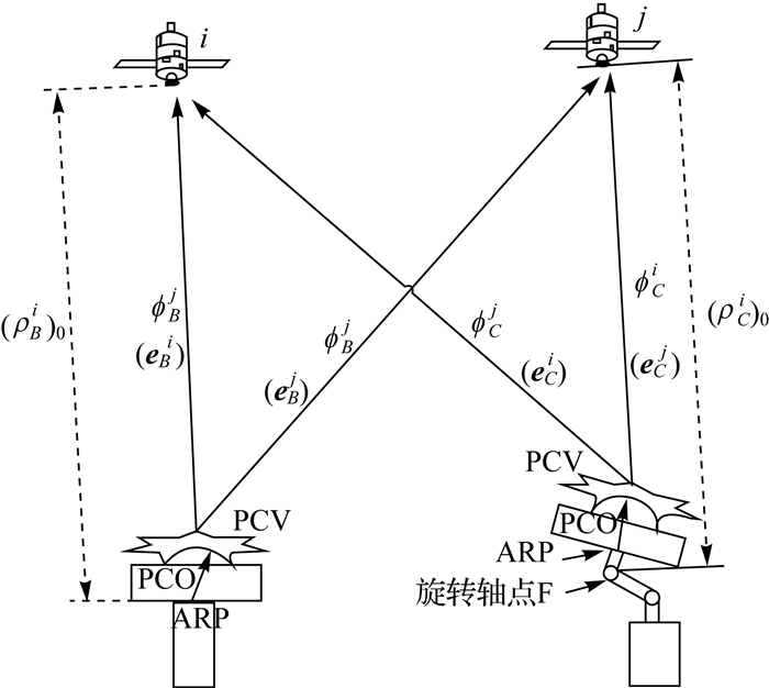 如图 2,与基准站不同的是,待测站方程中还包括了机械臂的固定旋转轴点F到待测天线ARP点的转动臂长在卫星矢量上的投影l=len·eCi改正。