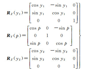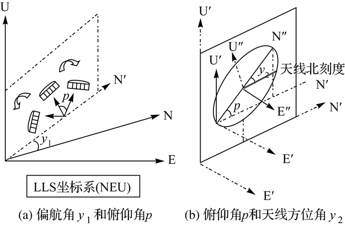 (3) 当地水平坐标系与天线固定坐标系转换。在上述模型中,卫星矢量是以天线固定坐标系(AFCS)为参考。在WGS-84坐标系下得到的站星矢量经转化后可以归算到当地水平坐标系(local level system,LLS)下。由LLS再转换到AFCS需要3步旋转。如图 3所示,第1个旋转角是机械臂安装固定后其Y轴与LLS北方向的夹角,记为偏航角y1。如图 4所示,第2个旋转角是天线的高度角,记为俯仰角p。第3个旋转角是机械臂控制的天线旋转方位角,在图 4中是天线北刻度与N″的夹角y2。经过3步旋转即可得到卫星矢量在AFCS系下的矢量e。上述旋转涉及的旋转矩阵如下