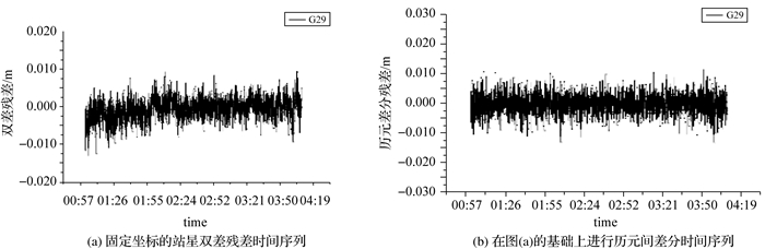 (5) 历元差分消除多路径效果。为了验证历元间差分对多路径消除效果,本文采集了采样率为1 Hz的3 h静态数据。固定先验坐标后G29的双差残差如图 5(a)。从图 5(b)的时间序列可以看出,历元间差分有效削弱了图 5(a)中2:00的波动趋势,呈现白噪声分布。