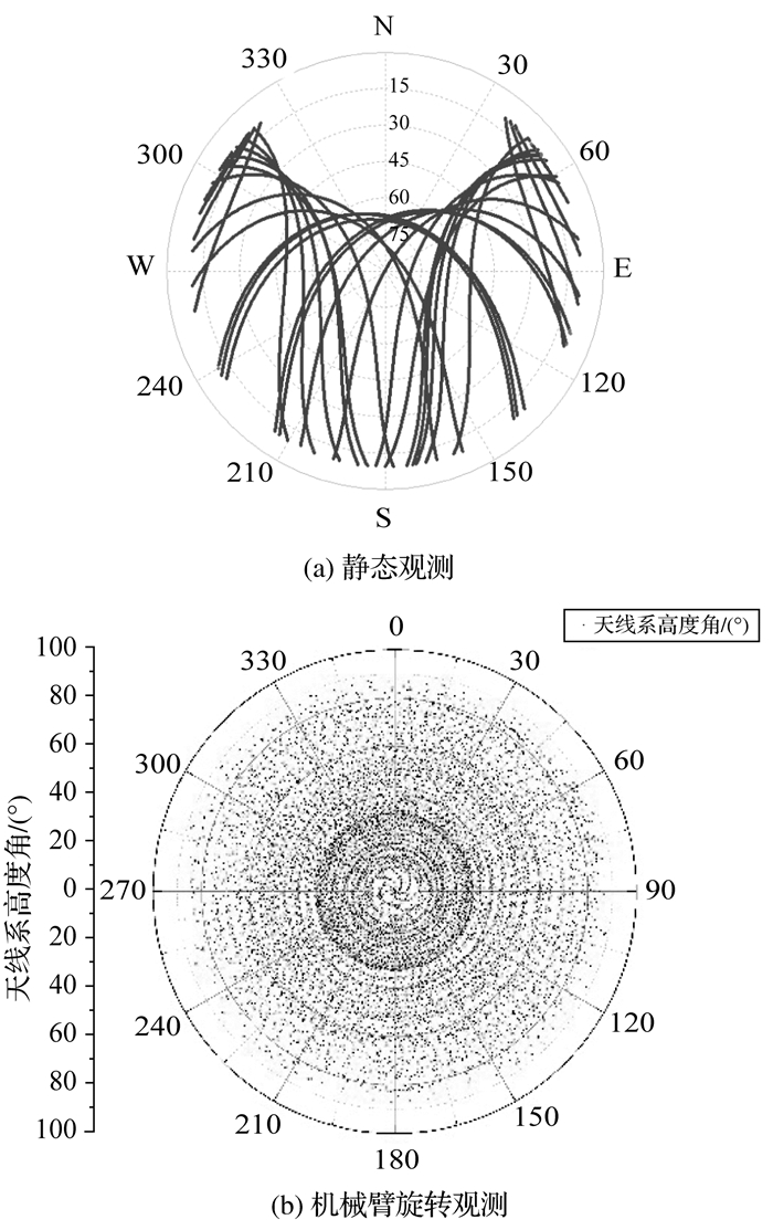 分析图 7可以发现,相较于静态观测卫星轨迹只能覆盖有限的区域,使用精密旋转机械臂控制待测天线其卫星轨迹分布均匀覆盖天线半球,能在数小时内得到几千个不同方向上的观测值分布。