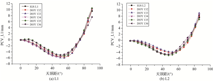 首先,按照四阶多项式拟合,即只拟合出GPS两个频点PCV值与卫星高度角(天顶距)之间的关系。由图 8可以看出,PCV的变化趋势随着天顶距增大(高度角降低)而先减小后增大。在低高度角处,最大可达到厘米量级。与IGS发布的拟合值比较(图中黑线)计算得到L1和L2的RMS分别为0.4、0.6 mm。