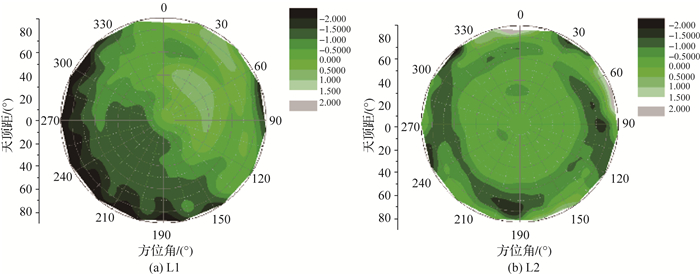 其次,采用方位角和高度角描述相位中心变化的8阶5次球谐函数拟合PCV值,采用多天解的平均系数反算格网点的PCV值,并与IGS发布的格网值做差,得到的结果如图 9所示。从中可以看出,极坐标系中天顶距小于75°时,大部分格网点数值小于1.5 mm;在75°~90°时,即卫星在低高度角处拟合差值最大达到了2 mm。