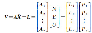 根据大量卫星矢量双差和历元差数据,将式(7)中的矢量展开为分量形式,利用最小二乘求解得到PCO的NEU 3个分量。记∇ΔeCji(t2, t1)的N、E、U分量分别为∇ΔeNji、∇ΔeEji、∇ΔeUji,则误差方程的矩阵形式为