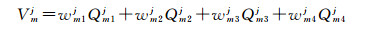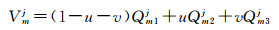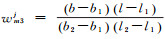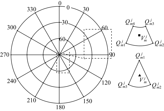 若卫星j信号传播方向在半天球上的穿刺点与半天球格网点参数间位置关系如图 1右侧下方图例所示。假定3个格网点参数Qm1j、Qm2j和Qm3j对应的经纬度坐标分别为(b1, l1)、(b2, l2)、(b2, l3),则三角形点表示的穿刺点Vmj处的模型参数计算值可通过平面内插方法[23-24]表达如下