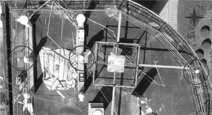 2 试验及结论 2.1 试验设计于2018年年积日DOY226-233,在武汉大学教学实验大楼顶楼开展验证分析。测试时布设了A、B、C 3个测站,其中A测站的西方向和B测站的东方向均安装了金属挡板,用于模拟强多路径观测环境,测站C未加装挡板,为正常的观测环境。测站相互间位置关系及周围观测环境如图 2所示。