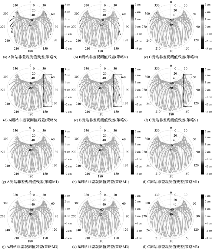 2.2 结果分析依据表 1的数据解算策略,图 3给出了A、B、C 3个测站各颗卫星在模糊度固定时段内的L1频率非差观测值残差,并按照星下点轨迹的方式进行展示。当未进行多路径误差改正时,A(N)、B(N)、C(N)的结果表明此时各颗卫星的非差观测值残差均相对较大。尤其是在A、B站加装挡板的位置,即A(N)左侧、B(N)右侧区域多路径影响尤为明显,出现了多组观测值残差偏大的现象。在使用SF方法进行多路径误差修正时需顾及卫星的轨道重复周期提前量,本次试验中设定轨道重复周期为一个恒星日,对应提前量为236s[11, 12, 25]。由A(S)、B(S)、C(S)的结果可知此时L1观测值所受多路径效应得到了有效削弱,但由于上述轨道重复周期提前量的存在导致DOY233部分时段观测数据无法进行多路径误差削弱。如A(S)、B(S)、C(S)中虚框所示,星下点轨迹存在端部残差值偏大的现象(简称为“末端效应”)。当采用本文提出的MHGM方法时,如A(M1)、B(M1)、C(M1)所示,即使仅采用前1 d的观测数据进行建模,卫星观测时段端部残差值偏大现象也能得到有效削弱,且整体而言对多路径误差改正的有效性要优于传统SF方法。当采用前2 d或3 d的观测数据进行建模时,MHGM方法的建模有效性可得到进一步提升,基本不存在卫星观测时段端部残差值偏大的现象。对比M3~5这3种策略下A、B、C 3个测站的非差观测值残差结果可以发现,其多路径误差的改善效率差异不大。分析认为,这是由于GPS的卫星轨道周期重复周期约为1 d,利用临近2~3 d的观测数据即可对GPS观测数据中所受多路径误差影响进行有效建模。限于文章篇幅,图 3仅给出了N、S、M1及M3策略下3个站的非差观测值残差结果。