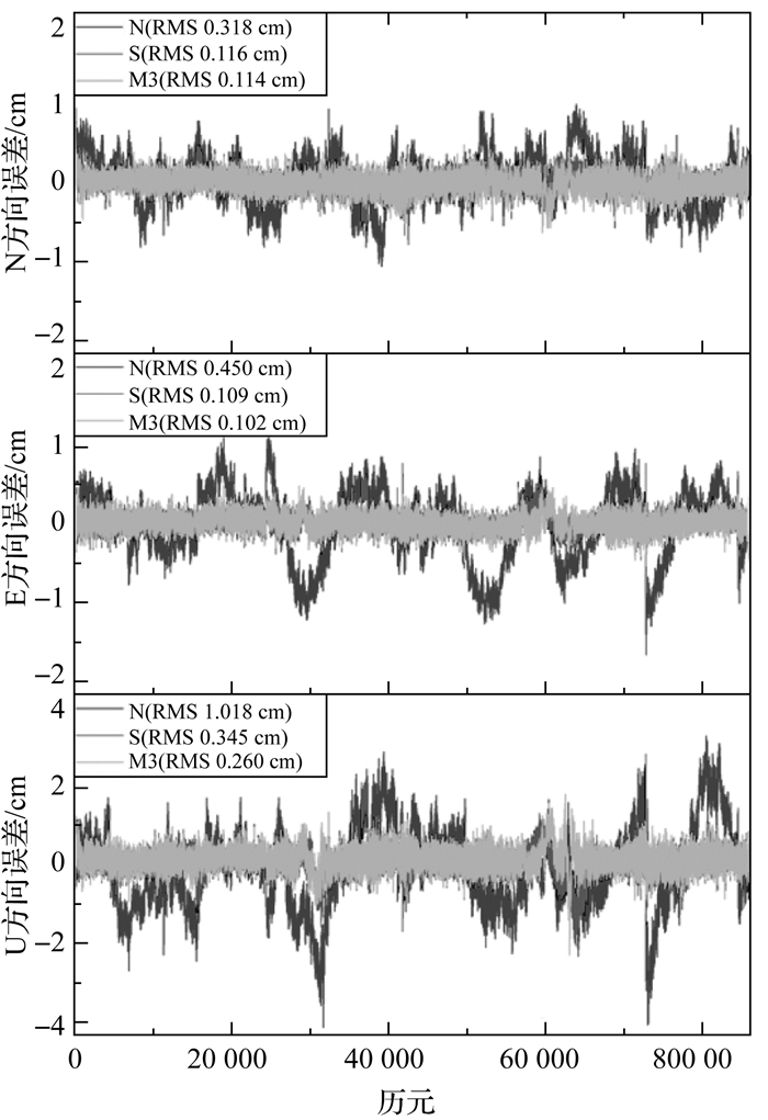 未进行多路径误差改正时,由于测站A、B均加装了挡板以模拟强多路径环境,因此定位精度较差。A、B两个测站的平面定位精度分别为5.51、4.95 mm,高程定位精度分别为10.18、9.61 mm。当采用SF方法进行多路径误差改正后,A、B两个测站的定位精度得到了明显改善,分别达到了平面1.59、2.54 mm,高程3.45、4.37 mm,三维定位精度的改善率分别高达67.2%和53.2%。当采用本文提出的MHGM方法进行多路径误差建模时,两测站A、B的定位精度分别提升至平面1.53、1.81 mm,高程2.60、3.38 mm,较SF方法在测站A、B的高程方向上能得到24.6%和22.7%的改善,在平面方向上其改善率也分别能达到3.8%和28.7%。为展示N、S、M2这3种处理策略对不同时刻对定位结果的影响,图 4给出了A站在N、E、U方向上的实时动态定位误差序列。