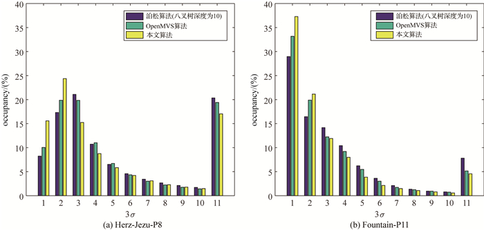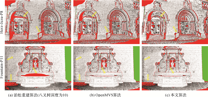 采用包含GROUND TRUTH的两组标准数据集Herz-Jezu-P8和Fountain-P11进行网格精度分析。文献[25]中的精度评定方法需模型的空三在同一坐标系下,因此本节将八叉树深度设为10,其余参数默认的泊松重建算法与参数全默认的OpenMVS算法与本文算法结果列入对比试验中,验证本文算法的有效性。