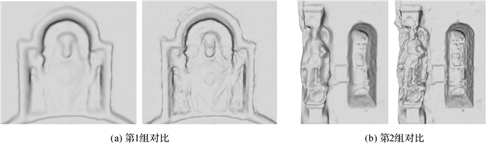 如图 11所示,(a)、(b)两组的左侧为无影像一致性约束结果,右侧为有影像一致性约束结果。可见影像一致性约束主要作用是使模型细节更加丰富,比如雕塑的轮廓、鼻子、衣服、动作等特征得以显现。