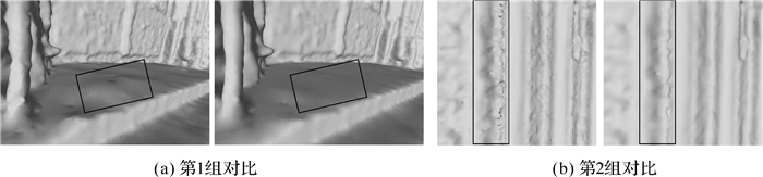 如图 13所示,(a)、(b)两组左侧为无线约束结果,右侧为有线约束结果。可见线约束项主要作用是使1.5节中提取出三维线特征的区域变得更加平直锐利,而未加线特征约束时,这些直线特征难以显现,真实感较差。