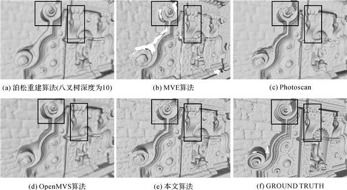 本文以标准数据集Fountain-P11和实景三维城市模型进行网格精化效果分析,对比试验包括泊松重建结果、MVE(multi-view environment)结果、Photoscan结果、OpenMVS结果、本文算法结果以及GROUND TRUTH对比。Photoscan软件各项参数精度都设为high,泊松算法八叉树深度为10,其余参数默认,MVE算法和OpenMVS算法均采用默认参数。图 14所示是Fountain-P11数据集的网格精化效果对比。从结果中可以看出泊松重建算法较平滑,MVE算法数据缺失较多,photoscan和OpenMVS结果较好,但都不如本文算法细节丰富,尤其可见墙壁上装饰物的竖线条区域。其余算法都无法显现出线特征而本文算法线特征明显,本文算法结果也最接近GROUND TRUTH。
