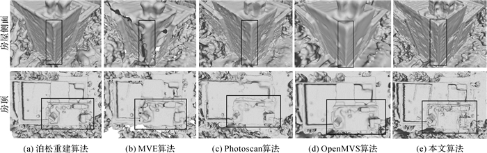 图 15所示为实景三维模型试验结果,第1行为房屋侧面对比图,第2行为房顶对比图。因为房屋和树木距离较近,泊松算法出现了大量错误重建,墙线处有大量异常凸包,而MVE算法产生了大量空洞,完整性差,Photoscan异常凸包减少,但细节较差,而且房顶轮廓未被重建出来,OpenMVS算法房顶重建质量较好,房顶轮廓很清晰,但细节不如本文算法,其侧面重建效果也不如Phhotoscan和本文算法,并且以上所有算法都不能保证墙线处的线特征。综上,本文算法能有效地减少噪声的影响,在保证表面一定程度平滑的情况下细节更为丰富,并且在加入线约束后能有效地保留边缘特征的尖锐特性,更接近于真实表面。