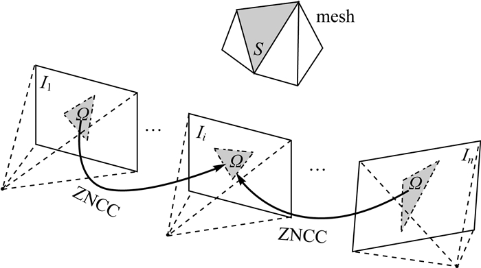 1.3 影像一致性约束影像一致性约束是衡量网格表面上的一个三维点投影到其可见的两张或多张影像上像素间的相似程度。NCC(normalized cross-correlation,归一化互相关)与ZNCC(zero-normalized cross-correlation,零均值归一化互相关)都是影像立体匹配中评价相似性较为常见的互相关计算方法。ZNCC相较NCC更为稳健,因为它在公式中减去了窗口内的均值,更能抵御光照的变化,因此本文采用ZNCC作为影像一致性计算测度。具体描述如下: