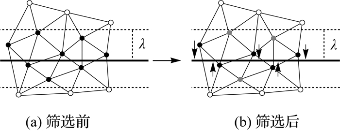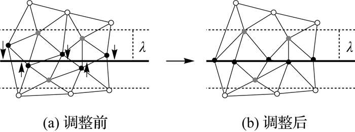 对于条件3,如果一个三角面的3个顶点同时满足条件1和条件2,则这3个顶点都会加入三维线段的周围点集,在进行线约束后会产生狭长三角形,不利于后续纹理映射步骤。因此需要做如图 5所示的操作,若存在这样的三角形,则筛选3个顶点,只将其中距离该线最近的两个顶点加入到待调整网格顶点集{v}中。图 5(a)中黑色实心点表示符合条件1和条件2的候选点集,黑色实心点构成的三角形是满足条件3的三角形,图 5(b)中黑色实心点为最终确定的待调整的网格顶点,灰色实心点为不调整的网格顶点。