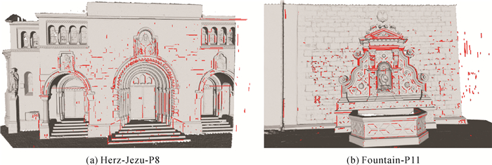 为了验证本文算法的可行性和效果,分别采用标准数据集和实际场景数据集进行试验。标准数据集采用Strecha等提供的3套数据集Fountain-P11、Herz-Jesu-P8、Herz-Jesu-P25,为地面近景数据,影像采用Canon D60拍摄,影像分辨率为3072×2048像素。从官网上下载得到Fountain-P11、Herz-Jesu-P8两套数据集的真实点云,使用Zoller+Forhlich IMAGER 5003采集,Fountain-P11数据有11张影像,Herz-Jesu-P8有8张影像。实际场景数据拍摄于武汉市洪山区武大园二路,用Sony A500组成的五镜头相机采集了114张分辨率为5456×3432的下视影像。