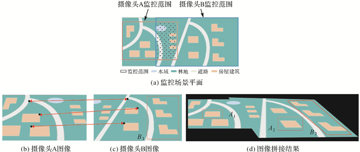 (2) 对于有一定重叠区域的监控视频,由于不同摄像头主光轴之间的夹角较大,导致匹配后图像变形较大。如图 1所示,图 1(a)为某一监控场景平面,矩形框内分别为摄像头A和B的监控范围,假设摄像头主光轴与地面夹角成60°,则摄像头A和B内图像分别为图 1(b)和1(c)所示,对两个图像进行拼接,结果如图 1(d)所示,可以看出,矩形框A1和A2内初始形状一致的房屋,在拼接后产生明显变形(A2),矩形框B1内规则排列的房屋,也出现了较大的拉伸与形变(B2)。