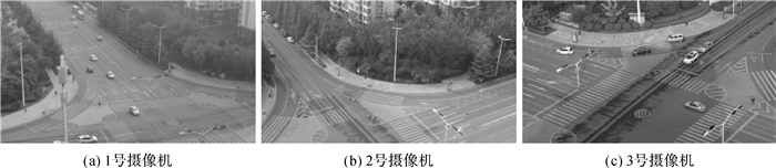 静态场景下视频拼接多基于特征匹配算法,常见的特征配准方法有:Moravec[4]、SIFT(scale invariant feature transform, SIFT)[5]、Harris[6]、Harris-Laplacian[7]等。其中尺度不变特征变换匹配SIFT算法因其对平移、旋转、尺度变化等均具有不变性,同时对噪声、光照变化、视角变化具有较强的稳健性,成为当前主流的图形拼接算法,但存在计算量巨大、耗时长等问题,近年来研究学者进行了很多改进与优化。如文献[8]将主成分分析法(principal component analysis,PCA)与SIFT结合,提出了PCA-SIFT算法;文献[9]将分块Harris特征与SIFT算法结合,引入图像角点对特征点选取进行约束;文献[10]基于SIFT算法,提出了一种控制帧约束下的固定摄像头视频拼接方法。上述算法在一定程度上提高了SIFT算法的准确度和效率。此外,也有学者考虑到室外环境的监控经常受到多模式背景的干扰,如随风摇动的树枝、草坪及运动目标等,采用高斯混合模型对各个视频序列进行背景建模,然后利用背景图像实现多个视频序列的拼接[11]。然而,这些方法多适用于视频间重叠区域较大的情况,且在特征点匹配过程中由于仅考虑图像几何特征,导致准确度较低。交通监控视频有其自身的特点,同一监控区域内不同摄像头之间重叠区域范围变化较大,经常出现重叠度较小的情况且主光轴之间的夹角大,当采用传统方法进行视频拼接时,会因重叠区域过小而导致无法拼接或图像变形过大。