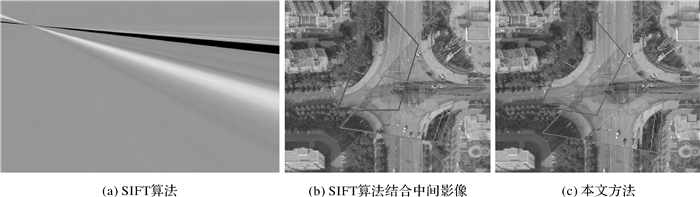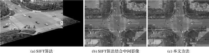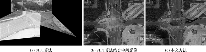 图 10所示交通监控视频区域,视频之间的重叠度约为8%,图 13为该场景拼接结果对比效果。由图 13(a)可以看出,由于重叠区域过小,SIFT算法无法进行拼接;将SIFT算法与中间影像结合,所得结果如图 13(b)所示,可以发现,中间影像有效解决了因重叠度较低而无法拼接的问题,但该拼接结果中地物存在较大程度变形,且接缝明显;而本文算法不仅实现了该区域的正确拼接,且看不到明显接缝,如图 13(c)所示。