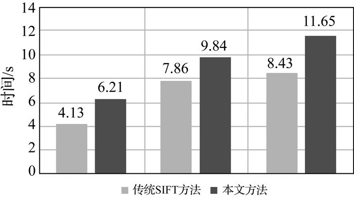 统计两种方法在特征匹配阶段寻找正确匹配点对的耗时,对于试验场景1,基于SIFT算法进行拼接所用时间为4.13 s,本文算法因需将两幅监控视频分别与正射影像进行匹配,故进行两次拼接,总用时为6.21 s(不包括语义分割时间);对于试验场景2、3,基于SIFT算法进行拼接所用时间分别为7.86 s、8.43 s,基于本文算法进行拼接所用时间分别为9.84 s、11.65 s(不包括语义分割时间),对应的直方图如图 14所示。由图 14可以看出,3种场景下两种方法耗时基本一致。此外,本文方法在SIFT匹配前还需要进行背景正射影像位置估计、语义分割及语义图块的匹配,降低了算法的实时性,但由于交通摄像头属于静态场景下固定监控点,本文算法只需进行首次正射影像位置估计、神经网络训练和特征匹配,计算获得单应矩阵后,后续的视频帧即可直接与正射影像利用该单应矩阵进行拼接,从而不会对视频拼接效率产生较大影响。