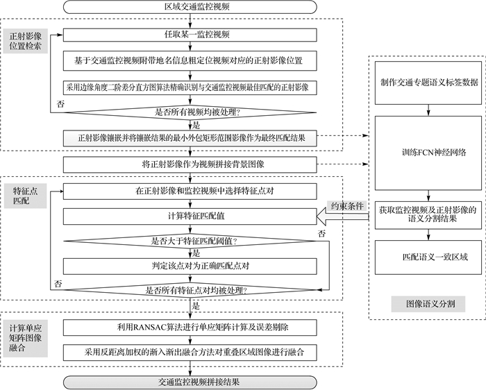 2 交通监控视频图像语义分割及其拼接方法基于交通监控视频自身特点,本文提出一种交通监控视频图像语义分割及其拼接方法。核心内容是:①正射影像位置检索:利用交通监控视频附带地名信息粗定位视频对应的正射影像位置,进而利用边缘角度二阶差分直方图精确识别与交通监控视频最佳匹配的正射影像;②基于全卷积神经网络的图像语义分割:使用全卷积神经网络识别监控视频和正射影像中的交通专题信息区域,如斑马线、道路等;③图像语义分割约束下的特征点匹配:以正射影像作为中间背景平面,利用语义分割信息作为约束,将待拼接视频分别与背景正射影像进行特征匹配;④分别计算待拼接视频与正射影像之间的单应矩阵,并对重叠区域进行反距离加权融合。本文方法完整处理流程如图 2所示。