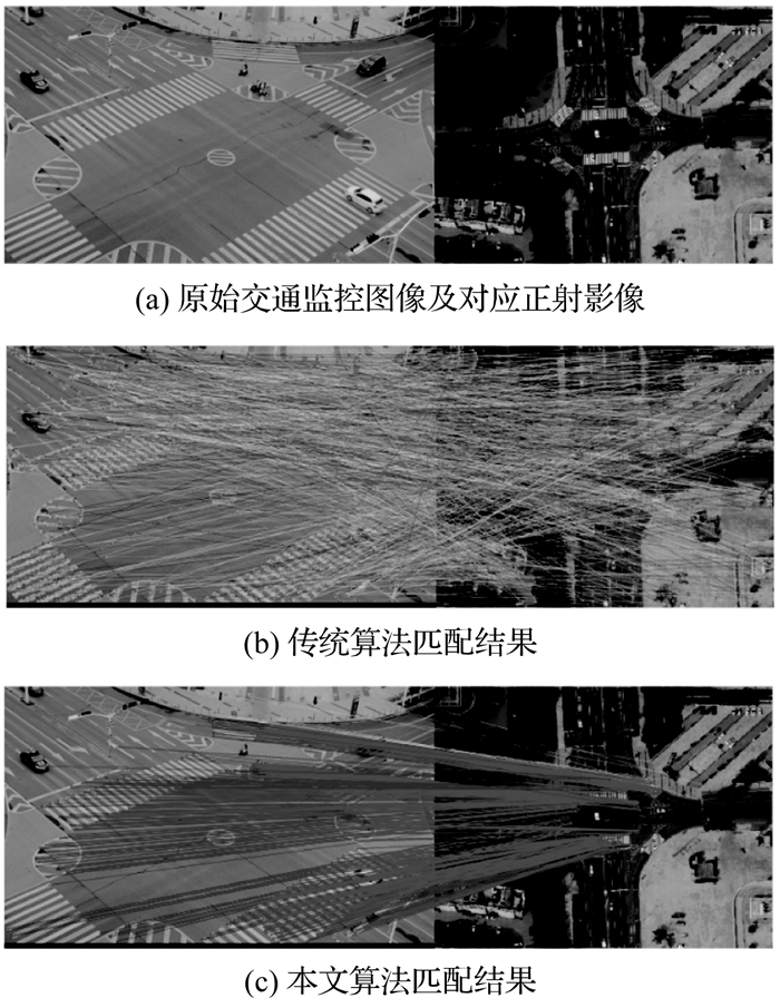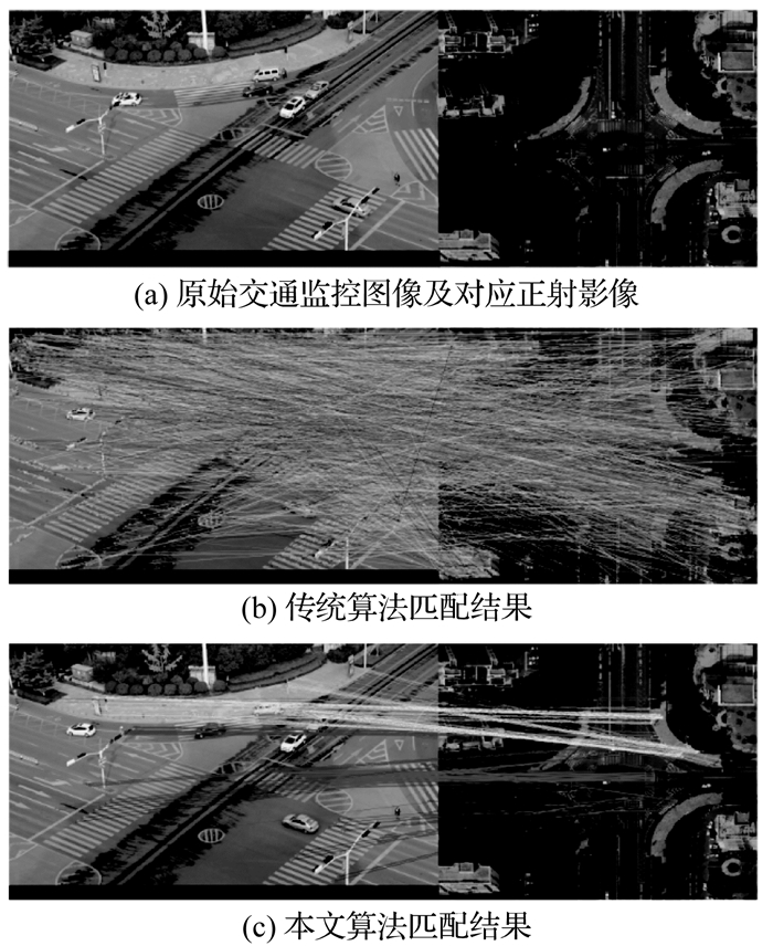 选取3个交通监控视频场景,分别用传统SIFT匹配算法以及本文提出的区域约束特征点匹配算法对该区域进行特征提取试验,其中传统特征点匹配算法使用BF(bruteforce)暴力匹配及KNN(k-nearest neighbor)匹配点对筛选算法,试验结果如图 5-图 7所示。从图 5(b)、图 6(b)、图 7(b)中可以看出,传统SIFT算法仅使用特征向量欧氏距离的相似度进行匹配,不可避免地会产生一些错误匹配,同时还有部分特征点散落在图像边缘,直接降低了特征点匹配的准确性;图 5(c)、图 6(c)、图 7(c)是本文提出区域约束特征点匹配算法试验结果,由于融合了图像高阶语义信息,提取的特征点集中分布在各个交通特征专题语义空间内,从而剔除了图像中大量的误匹配,优化了特征匹配点数量。
