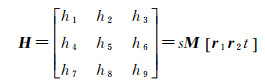 式中,hi(i=1, 2, …, 9)为坐标转换参数;s为比例因子;M为相机内参数矩阵;r1、r2为相机外参数中旋转矩阵的列分量;t为外参数的平移向量。