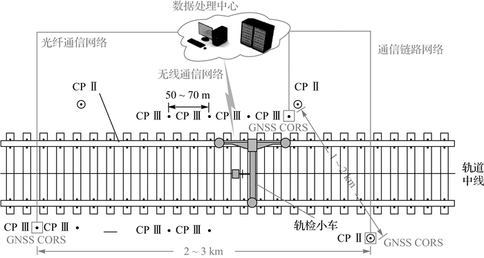 1 主要构成GNSS/INS多传感器组合高速铁路轨道测量系统主要由4部分组成,包括高速铁路专用GNSS连续运行参考站系统(continuously operating reference system,CORS)(以下简称GNSS CORS)、GNSS/INS多传感器组合高速铁路轨道几何状态测量仪(以下简称轨检小车)、数据处理中心和通信链路网络。如图 1所示。