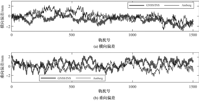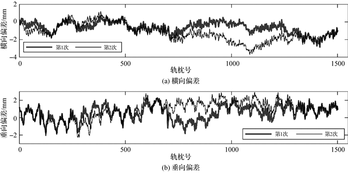 | 图 8 GNSS/INS多传感器组合高速铁路轨道测量系统两次测量横向/垂向偏差对比 Fig. 8 Comparison of lateral/vertical deviation between measured and designed values of track centerline using the track measurement system based on GNSS/INS and multisensor for high-speed railway |