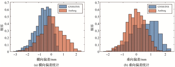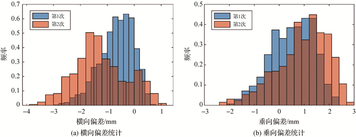 | 图 9 GNSS/INS多传感器组合高速铁路轨道测量系统两次测量横向/垂向偏差统计 Fig. 9 Histogram of lateral/vertical deviation between measured and designed values of track centerline using the track measurement system based on GNSS/INS and multisensor for high-speed railway |