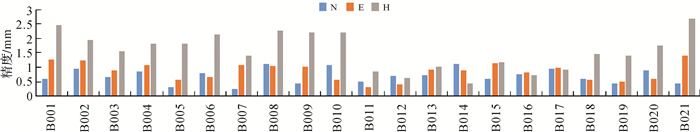 图 12表示2018年6月1日-2018月20日测试路段沿线布设的21个GNSS CORS变形观测点的精度统计情况,按每3天对GNSS CORS观测数据解算1次,其测量精度水平方向0.77 mm、垂直方向1.48 mm,能够满足对轨道路基变形监测的精度要求。