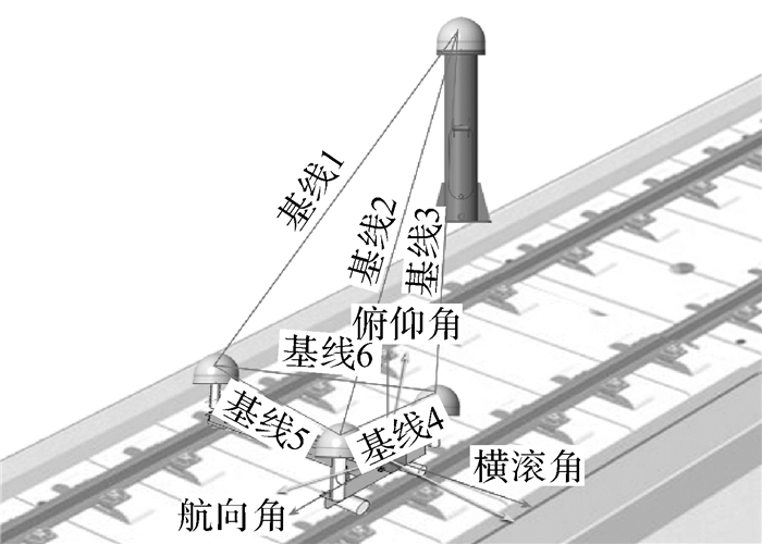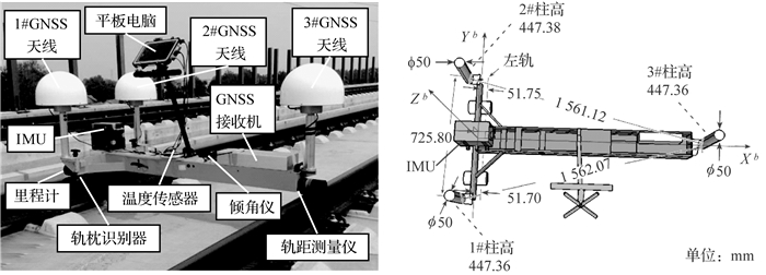 1.2 轨检小车轨检小车的主要构成如图 2所示。即T形小车上搭载了多种传感器。包括三天线GNSS一体接收机、IMU、里程计、倾角仪、轨距测量仪、轨枕识别器、温度传感器和数据存储装置等.由于高速铁路沿线环境特殊。有些路段卫星信号不佳。研制了三天线GNSS一体接收机。可以增加观测数据的冗余度、连续性和可靠性。且3个GNSS天线的几何关系经过严格标定(如图 2所示)。可用于GNSS观测数据预处理和对计算结果进行检核。其定位结果比单天线GNSS定位结果精度更高。且更加稳定可靠.该接收机具备440个通道。可同时接收来自三天线的北斗卫星导航系统(BeiDou navigation satellite system。BDS)/GPS/GLONASS三系统八频率的GNSS信号。具体包括BDS B1/B2/B3、GPS L1/L2/L5和GLONASS L1/L2。并针对高速铁路特殊的观测环境对该接收机的电磁兼容性、防水、抗震等方面做了特殊设计.IMU采用中国自主研发的某光纤惯性导航系统。其航向精度0.05°。俯仰、横滚精度0.02°.通过精密的结构设计与基于ARM架构主控板开发。实现了多传感器的精密安装、统一供电、统一时空基准、合理配置重量、动态数据采集等功能.该轨检小车既可用于测量轨道外部几何参数。也可用于测量轨道内部几何参数。