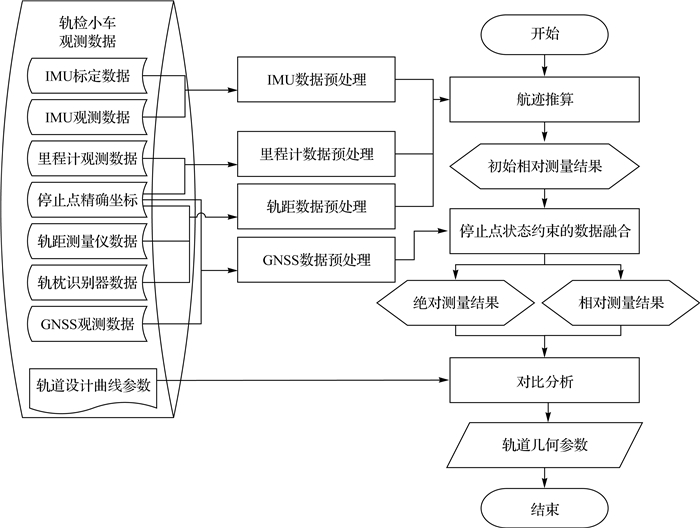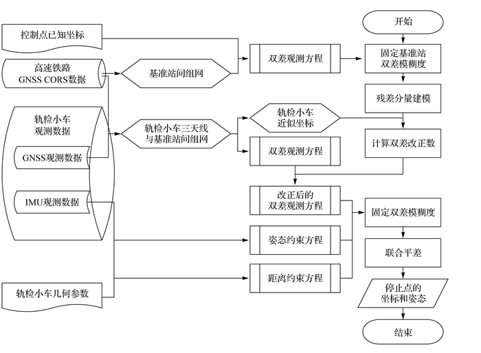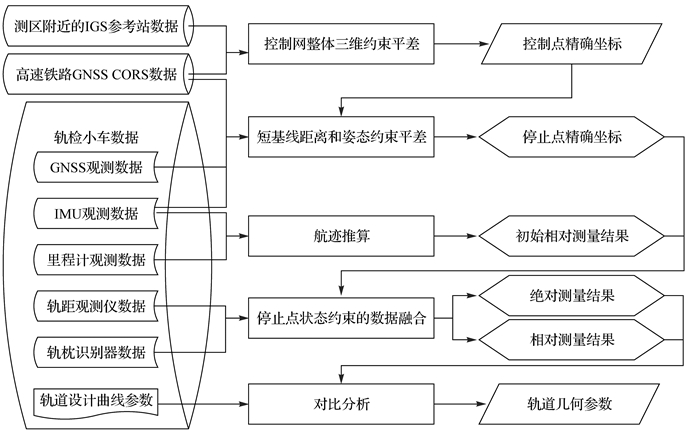 2 方法流程数据处理中心对轨检小车的各传感器、GNSS CORS及其附近的IGS参考站的大量观测数据进行集中处理分析并形成最终的施工方案. GNSS/INS多传感器组合高速铁路轨道测量方法流程如图 3所示。