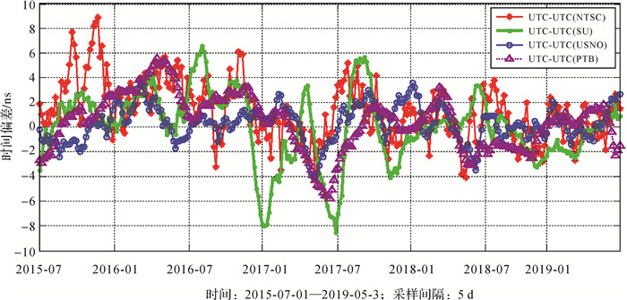 1 协调世界时偏差误差(UTCOE)评估方法 1.1 时间溯源及UTCOE定义内涵对一般授时用户而言,经常涉及的时间主要包括:UTC、UTCr、UTC(k)和卫星导航系统时间。协调世界时(UTC)是目前国际法定的标准时间尺度,它由国际权度局(BIPM)保持。UTC是在统一的国际原子时TAI的基础上产生的纸面时间尺度[11]。为了与地球不规则自转保持一致,根据国际地球自转服务组织(IERS)对地球自转的天文观测数据,对UTC实施闰秒调整(正1 s或负1 s)[12]。全球80多个守时实验室的500多台原子钟为UTC的计算提供数据。根据每个守时实验室的原子钟数量以及性能来确定其在UTC计算时权重的大小,权重值反映了该实验室对UTC的贡献大小[13]。这些守时实验室所保持的协调世界时UTC(k)是UTC的本地物理实现,k表示实验室名称。例如,中国科学院国家授时中心(NTSC)保持的协调世界时称为UTC(NTSC),美国海军天文台(USNO)保持的协调世界时称为UTC(USNO),俄罗斯时间与空间计量研究院(SU)保持的协调世界时称为UTC(SU),德国物理技术研究院(PTB)保持的协调世界时称为UTC(PTB)。BIPM通过T公报的方式每月发布UTC(k)相对于UTC的溯源偏差,每5 d一组结果[14]。图 1显示了2015年7月—2019年5月BIPM T公报发布的UTC-UTC(k)的偏差。从图 1可以看出,2015年7月—2019年5月,NTSC、USNO、SU和PTB保持的协调世界时与UTC偏差均保持在±10 ns之内。其中,UTC(USNO)与UTC的偏差控制在±4 ns;2018年以后,UTC(NTSC)与UTC的偏差也控制在±4 ns以内。