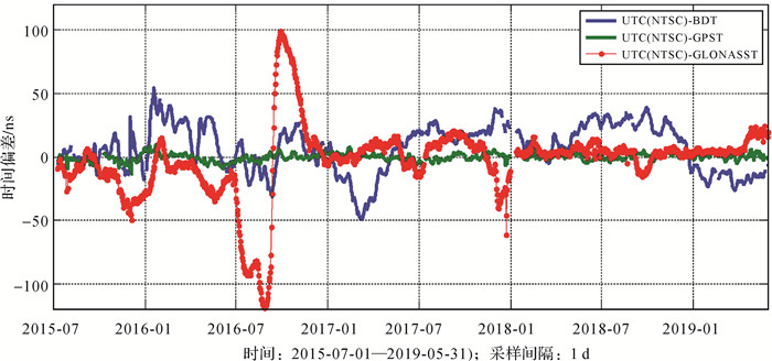 2 评估结果 2.1 UTC(NTSC)相对于各GNSS系统时间的偏差图 4给出了监测得到的UTC(NTSC)相对于各GNSS系统时间的偏差,红色、绿色以及蓝色曲线分别表示相对于UTC(NTSC)的GLONASST偏差、GPST偏差和BDT偏差。从中可以看出,2015年7月—2019年5月,在中科院国家授时中心监测的GPS系统时间偏差波动最小,整个监测时段波动范围为±10 ns。BDT的时间偏差波动范围在±50 ns。GLONASST的时间偏差波动范围在-120~100 ns。2016年8月下旬—2016年9月下旬,GLONASS系统时间偏差从大约-120 ns快速积累,达到100 ns。由此判断,GLONASS地面时间系统以大约8.5e-14的相对频偏进行频率调整,随后进行较为缓慢的反向频率调整,然后其系统时间偏差再次保持在与协调世界时偏差一致的水平。从2018年1月1日—2019年5月31日,监测得到的GLONASST时间偏差波动范围为-15~25 ns,较为稳定。