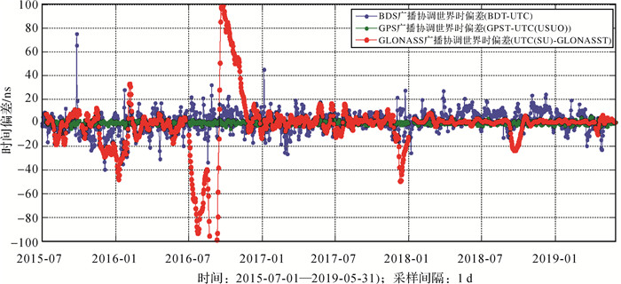 除了GLONASS系统是通过导航电文广播GLONASST相对于UTC(SU)的钟偏预报值之外,BDS-2和GPS系统都是在其导航电文中广播协调世界时偏差的预报模型参数,该预报模型参数包括钟偏A0,以及钟速A1(相对频偏)。在BDS-3的B1C和B2a新信号、GPS L5C和L2C民用信号上的导航电文还增加了A2参数(频率漂移)。图 5给出了BDS、GPS以及GLONASS系统广播协调世界时偏差比较图。可以看出,从2015年7月—2019年5月,BDS-2导航电文广播协调世界时偏差BDT-UTC的波动范围在±20 ns,与图 4中监测的UTC(NTSC)-BDT偏差波动范围以及变化趋势均不一致。GPS系统广播的协调世界时偏差GPST-UTC(USNO)波动范围在±6 ns。GLONASS系统的导航电文广播的协调世界时偏差UTC(SU)-GLONASST的波动范围在±100 ns,波动范围较大,但与图 4中监测的UTC(NTSC)-GLONASST偏差相比较,二者的波动范围以及趋势均一致。