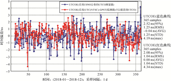 采用GPS UTCOE直接评估方法验证本文提出的基于UTC(NTSC)和BIPM时间公报的UTCOE间接评估方法的准确性。将2018年1月1日—2018年12月31日美国海军天文台(USNO)网站上公布的协调世界时偏差监测值(间隔为每天)作为真值,计算得到GPS广播的协调世界时偏差误差序列(直接法),如图 6中蓝色曲线所示。然后再采用本文提出的协调世界时偏差计算方法(间接法),计算相同时间段的GPS广播的协调世界时偏差误差,如图 6中红色曲线所示。对这两个时间误差序列分别进行95%,均方根(RMS)、平均值(AVG)、标准偏差(STD)以及最大值(max)统计比较,见表 2。