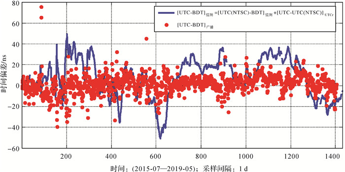 | 图 7 2015年7月—2019年5月BDS UTCO广播值与参考值比较 Fig. 7 Comparison of BDS broadcast UTCO with UTCO reference from July 2015 to May 2019 |