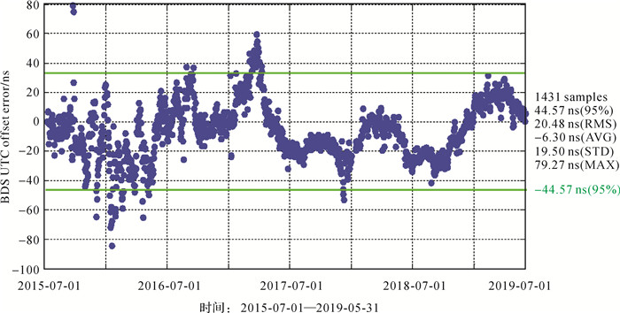 图 8显示了BDS的UTCOE评估结果,图中的点表示每天一个UTCOE计算值。在2015年7月1日—2019年5月31日时间段内,BDS UTCOE的统计结果分别为:44.57 ns(95%)、20.48 ns(RMS)、-6.30 ns(AVG)、19.50 ns(STD)、79.27 ns(max)。