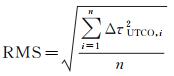 式中,τUTCO_B,i表示第i天的UTCO_B;τUTCO_R,i表示第i天的UTCO_R;ΔτUTCO,i表示第i天的UTCOE。对ΔτUTCO,i时间误差序列进行月和年统计,取95%分位点的偏差即可得到对应UTCOE统计结果。对北斗系统而言,可以对时间误差序列ΔτUTCO,i进行月和年的RMS统计,计算公式如下