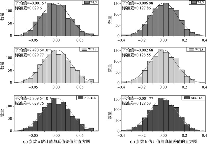 用3种方法估计的参数值减去给定值,分析后发现:①以式(34)或式(35)为约束条件计算的参数估值相同;②就单次模拟计算而言,没有明确规律表明哪一种方法估计的参数值最接近给定值。将这些差值作直方图统计,并拟合出对应的正态分布曲线,如图 1所示。从中可以发现:①WTLS和NECTLS的标准差比WLS的略大,WTLS的比NECTLS略大;②WTLS和NECTLS的平均值比WLS的小,NECTLS的最小。