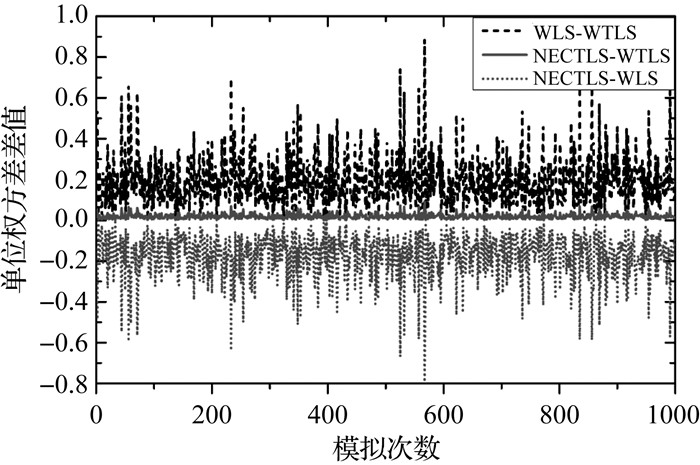 WLS-WTLS和NECTLS-WTLS的值始终为正值,说明WLS和NECTLS的验后单位权方差始终比WTLS的大;NECTLS-WLS的值始终为负值,说明NECTLS的验后单位权方差始终比WLS的小。因此,3种方法计算的验后单位权方差的大小关系为:WLS>NECTLS>WTLS,3种方法模拟1000次的平均值分别为1.184 07、1.013 75、0.994 19。