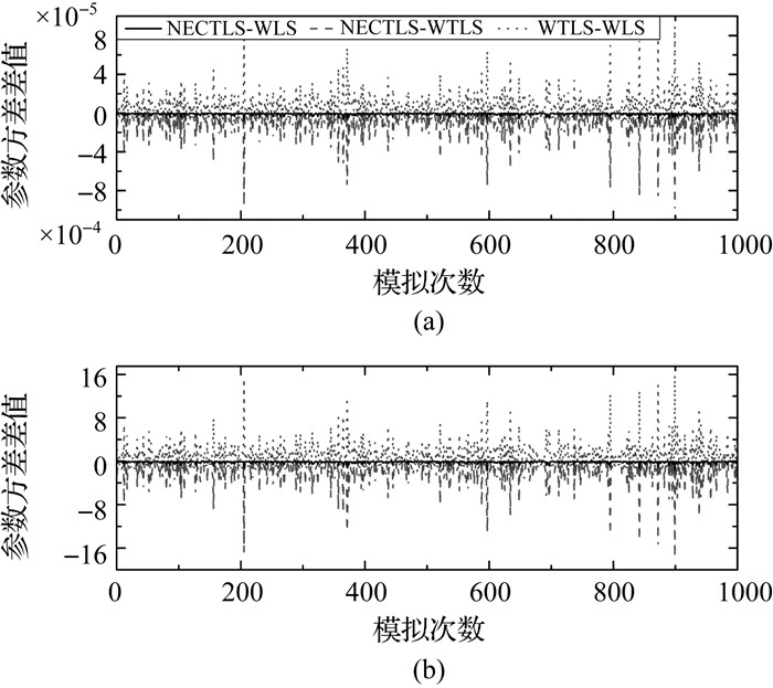 | 图 5 正交距离平方和差值 Fig. 5 Difference of ∑dl2 between NECTLS and WLS, NECTLS and WTLS |